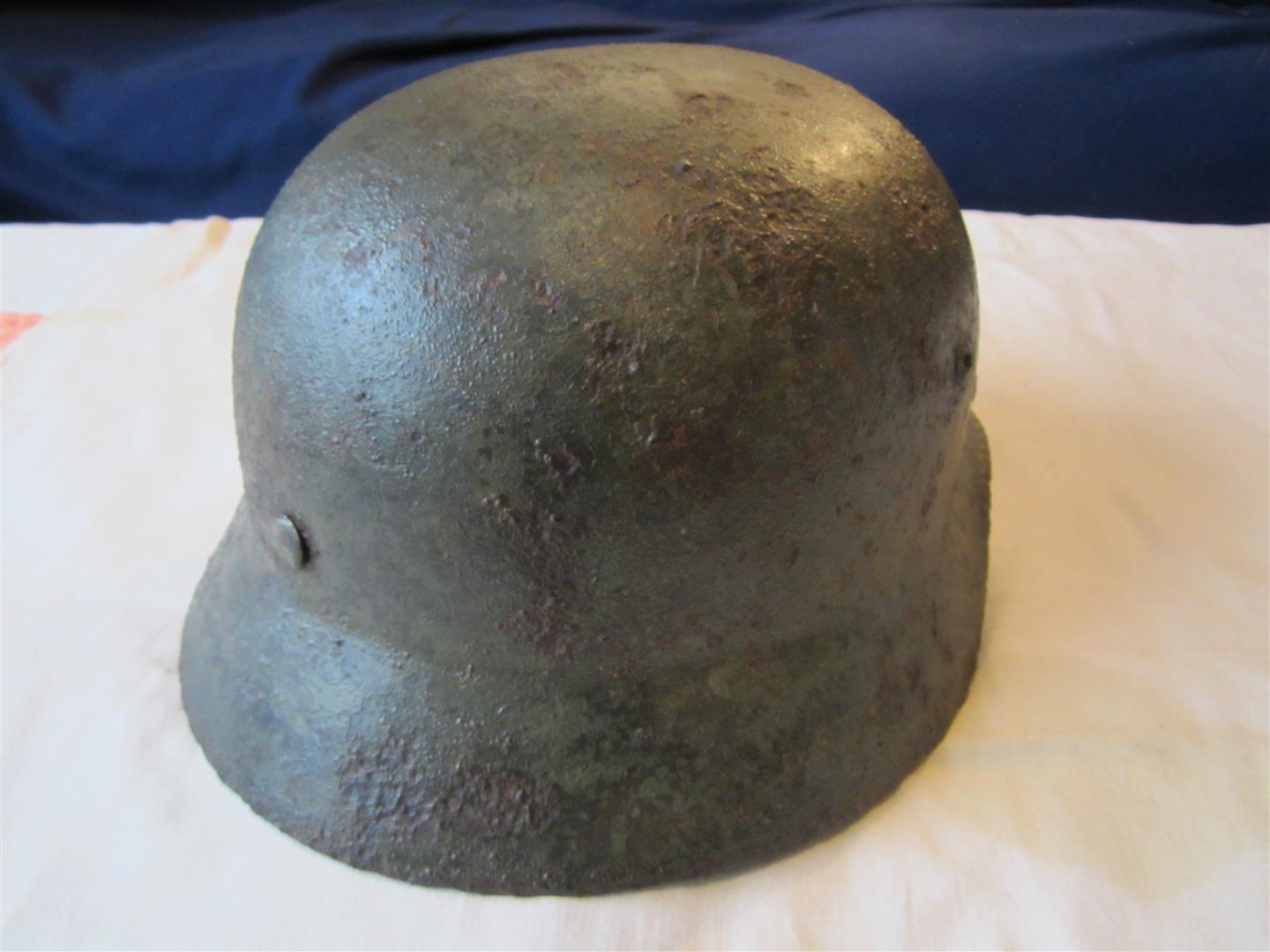 This is an original M35 Original WH Helmet, single decal, found in 2013 in the defence line of the Mius River in East Ukraine. This was a heavy defence line set up between the German forces west of Stalingrad. The area this helmet was found was attributed to the 60th Infantry Division. Very good condition considering how long it has been in the ground. There is a small shrapnel hole in the crown and some cracking. A lot of the original paint is still to be seen. The liner is original but added to the helmet recently to make it more complete.